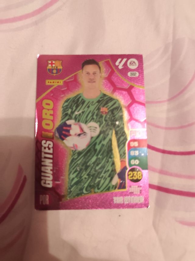 Detalles del productoTarjeta coleccionable de Marc-André ter Stegen, portero del FC Barcelona. Es una carta Adrenalyn XL, Guantes de Oro.