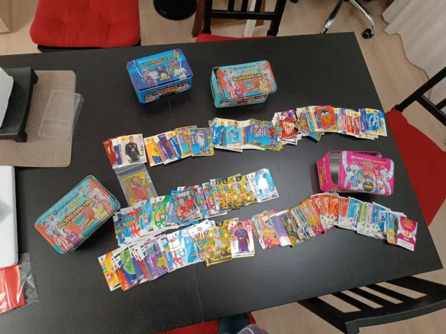 Tacos de cromos de temporadas 21/22, 22/23 y 23/24 y cajas metálicas. Se vende el conjunto, algunas en buen estado, otras dañadas