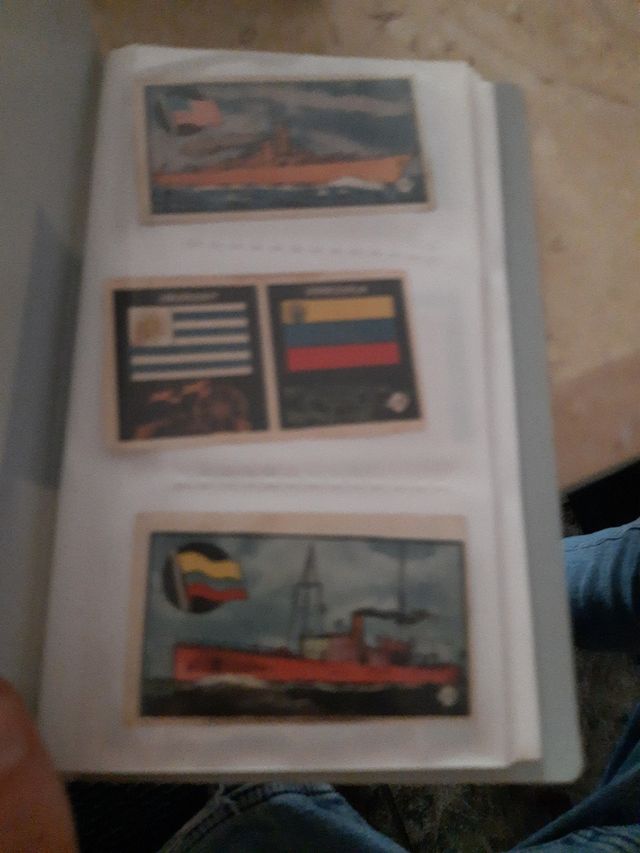 Detalles del productoColección de cromos antiguos con ilustraciones de barcos y banderas.