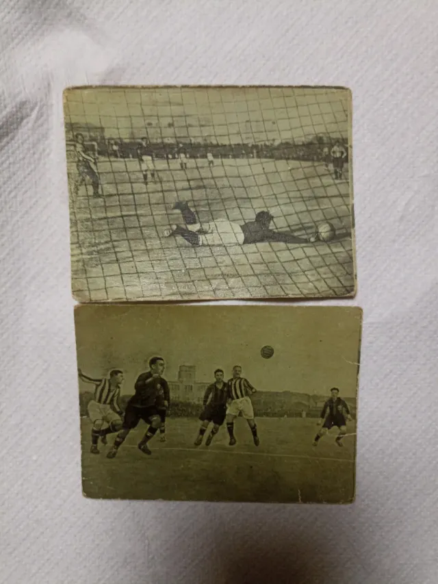 Colección de cromos antiguos de fútbol, ideales para coleccionistas. - Imágenes de partidos de fútbol de época. - Representan momentos de juego y jugadores.