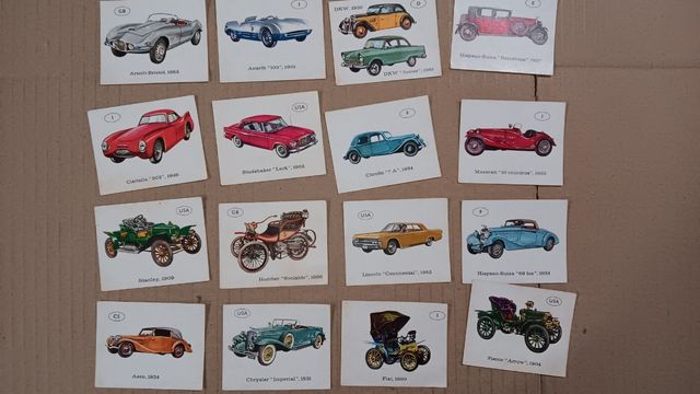 61 cromos de coches antiguos en buen estado. Regalo 8 repetidos.