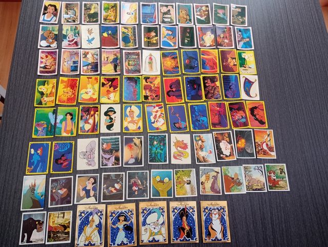 Cromos antiguos de Disney. Hay 84 cromos, entre ellos: - 28 La Bella y la Bestia - 29 + 5 Aladdin - 10 La Sirenita - 4 Blancanieves - 8 El Libro de la Selva