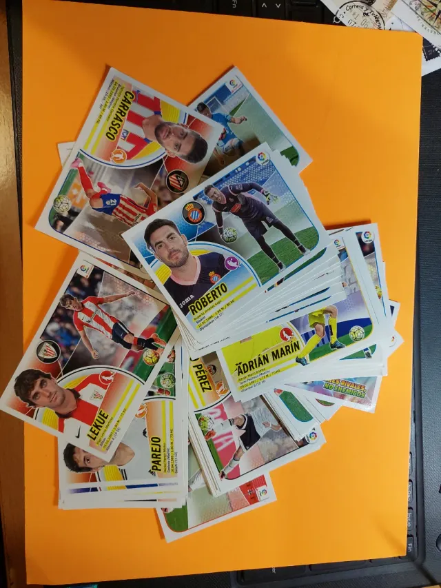 Detalles del productoColección de cromos de fútbol de la edición Este 2016-2017. Incluye jugadores como Carrasco, Roberto, Parejo, Lekue, Adrián Marín y J. Pérez.