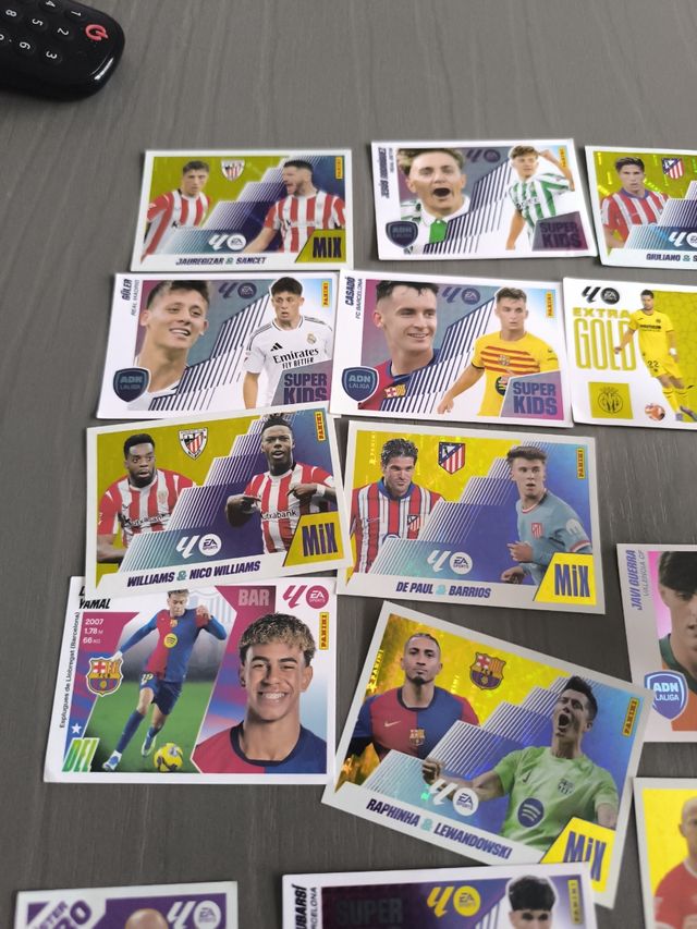 - Cromos de jugadores como Yamal, Güller, Williams, De Paul, Raphinha y Lewandowski.