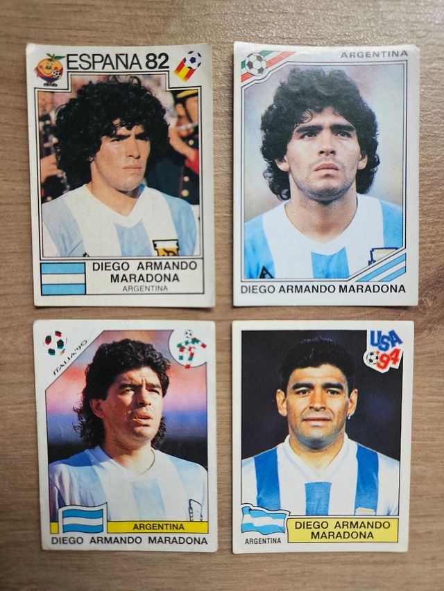 Detalles del productoLos 4 cromos de Maradona en los mundiales con Argentina. Panini. Nunca pegados.
