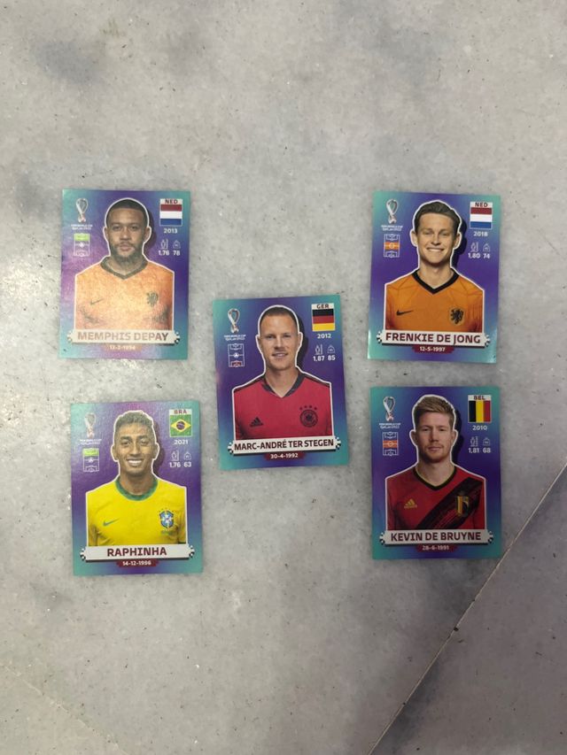 Detalles del productoSe venden cinco cromos de la Copa Mundial de la FIFA Qatar 2022. Son cromos brillantes y están en buen estado.