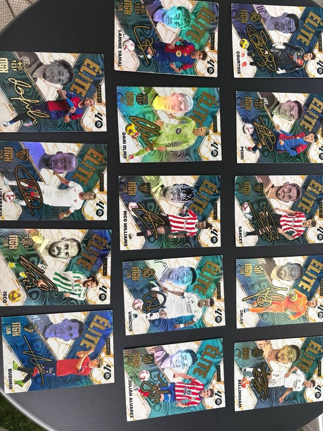 Colección de cromos Panini Elite con firmas. - Cromos de jugadores de élite. - Firmas auténticas de futbolistas. - Diseños de Panini Elite.