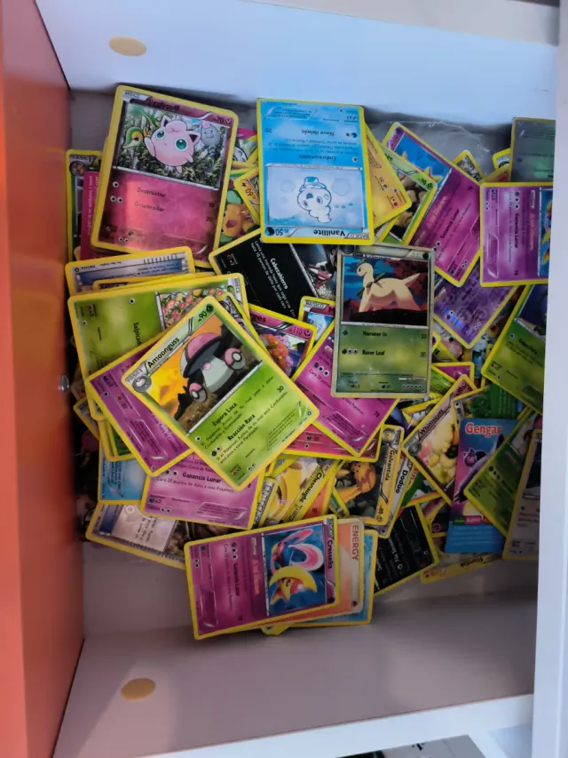 Lote de cromos de Pokémon. - Incluye cartas como Jigglypuff, Vanillite, Amoonguss, Gengar y Cressella. - Variedad de Pokémon y tipos de cartas.