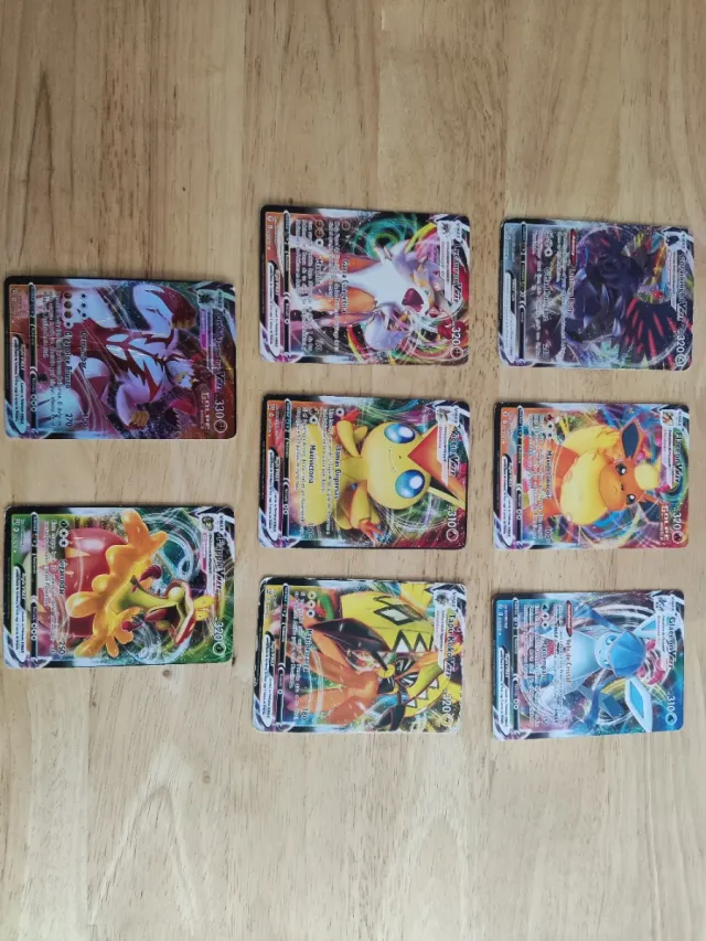 Colección de cromos Pokémon VMAX. - Incluye varios Pokémon. - Diseños coloridos y detallados.