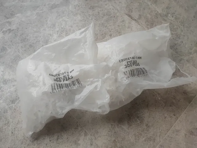 2 paquetes de crucetas para alicatado. - Material: PVC. - Medida: 1 mm. - Cantidad: 300 piezas. - Son 2 bolsas abiertas, en total habrá más de 300 piezas.