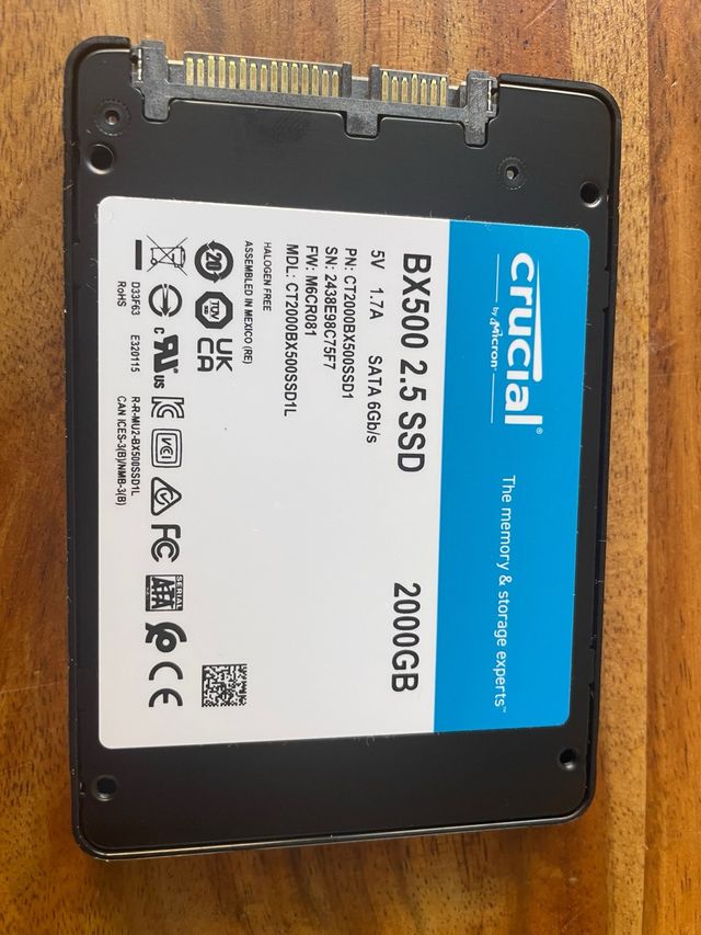 Disco de estado sólido Crucial BX500 de 2TB. - Capacidad: 2000GB - Interfaz: SATA 6Gb/s - Formato: 2.5 pulgadas - Modelo: CT2000BX500SSD1L - Voltaje: 5V 1.7A