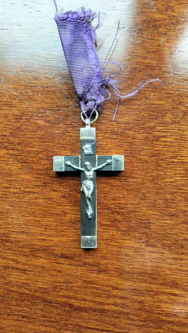 Detalles del productoPequeño crucifijo antiguo con detalles plateados y una cinta morada desgastada.