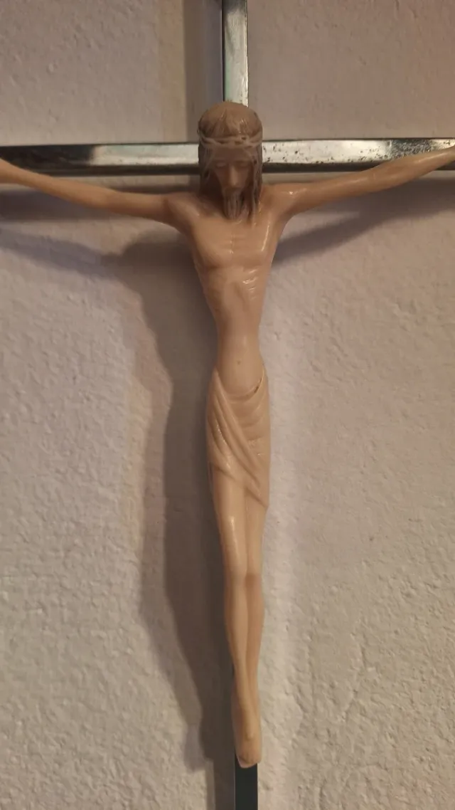 Crucifijo decorativo con figura de Jesús. - Figura de Jesús con corona de espinas. - Detalle de túnica - Colgante para pared _ Cruz metálica