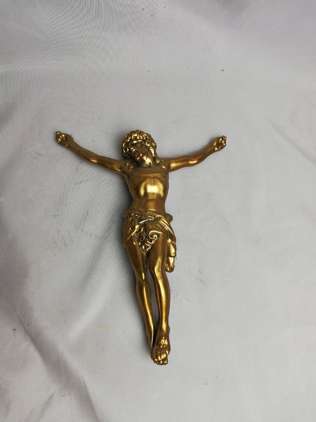 Detalles del productoFigura de Jesús Cristo crucificado en tono dorado. Ideal para decoración religiosa o como objeto de devoción.