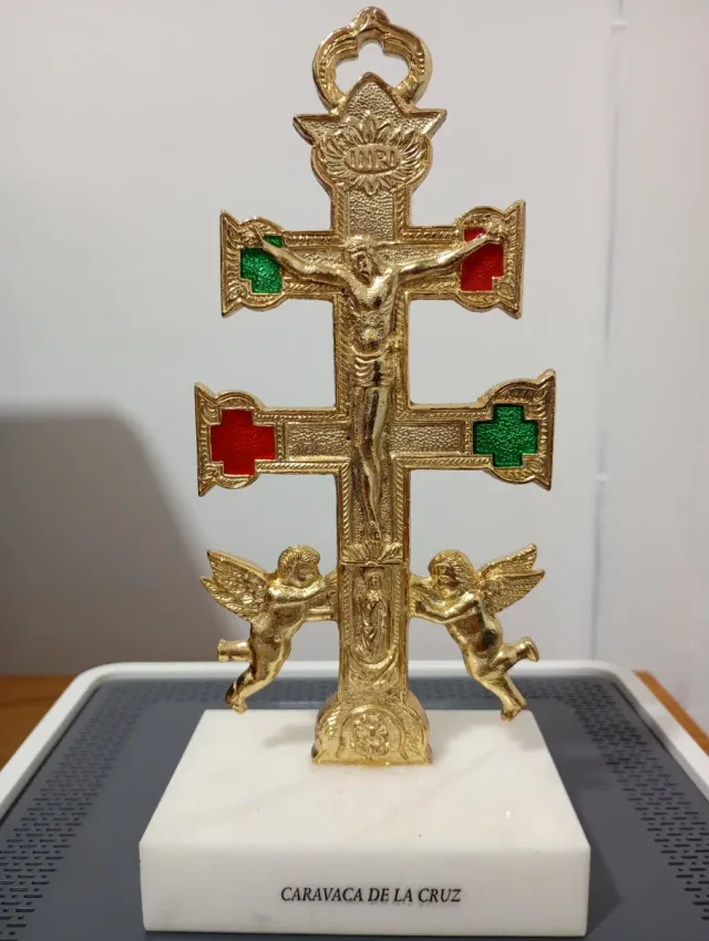 Detalles del productoCruz de Caravaca dorada con detalles en rojo y verde, y dos ángeles a los lados. La base es de mármol blanco con la inscripción CARAVACA DE LA CRUZ.