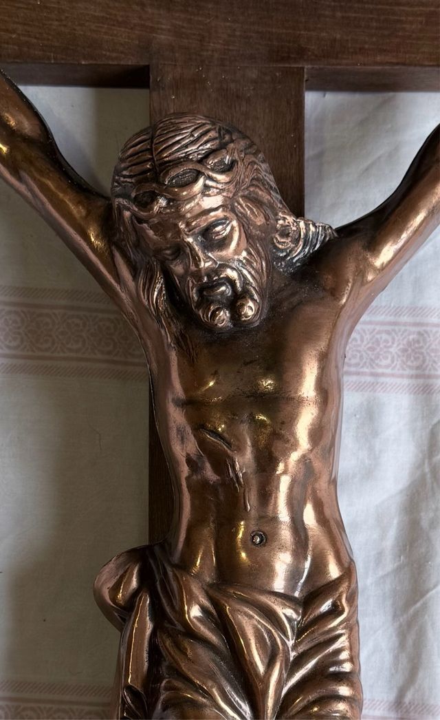 Cruz de Jesús elaborada en bronce con base de madera. - Figura de Jesús en bronce. - Base de madera.