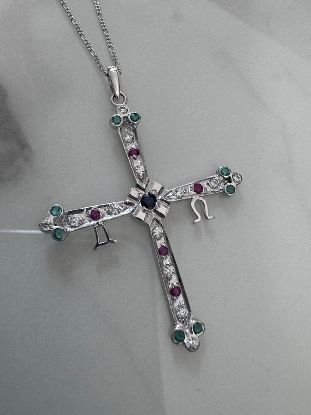 Detalles del productoCruz de la victoria oro 18 k blanco, brillantes y piedras preciosas.