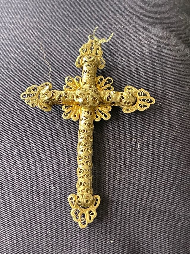 Preciosa cruz de rosario elaborada a mano, con un intrincado diseño. - Pieza de orfebrería del siglo XIX. - Diseño muy trabajado y detallado.