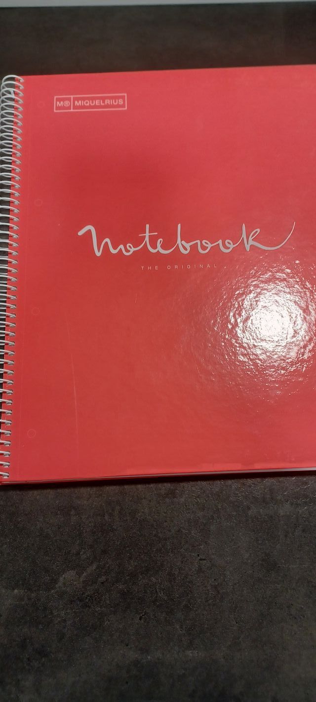 Detalles del productoCuaderno Miquelrius de rayas, tamaño A4. Es un cuaderno nuevo, con cubierta roja y brillante.
