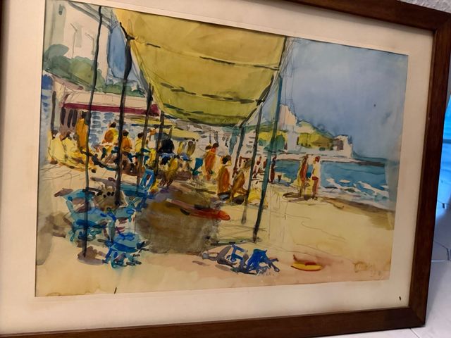 Detalles del productoPintura original en acuarela que representa una escena de playa con toldos y gente.