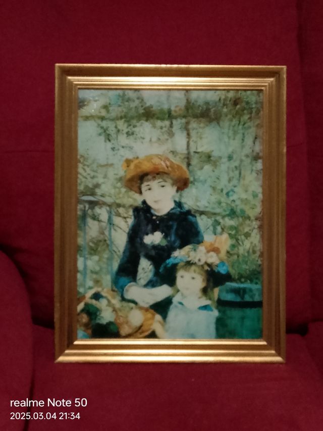 Cuadro antiguo pintado sobre madera,con precioso marco en pan de oro y firmado con filigrana.Autor(PIRRE-AUGUSTE RENOIR)-Titulo:En la terraza (dos hermanas)