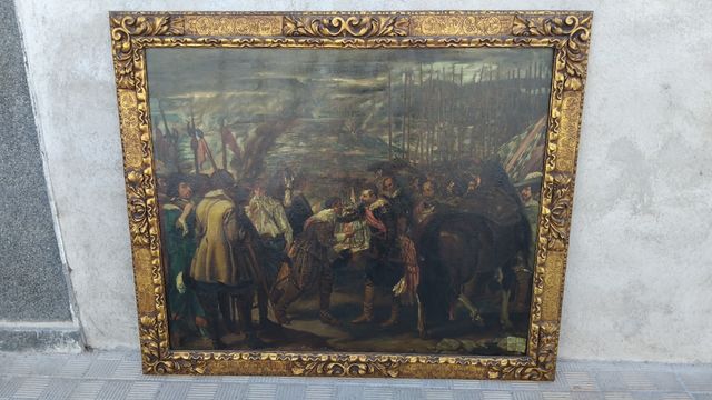 Antiguo cuadro con marco dorado. - Marco con detalles ornamentales. - Lienzo con escena histórica. - batalla de las lanzas