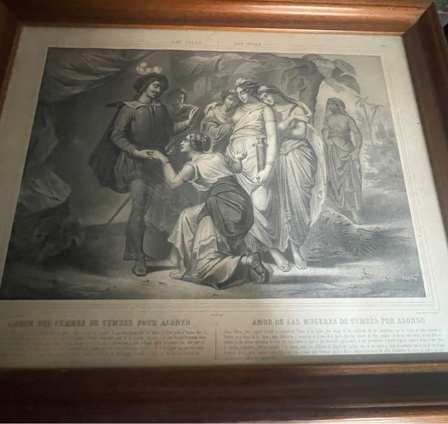 Antiguo cuadro con una escena romántica. - Marco de madera. - Representación artística de Amor de las mujeres de Tumbes por Alonso. - Texto en francés y español en la parte inferior.