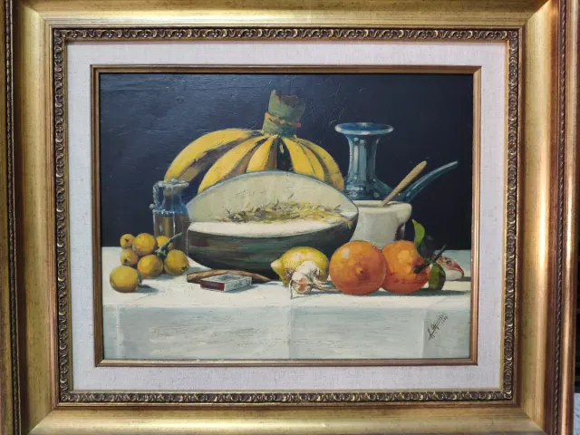 Antiguo cuadro de bodegón pintado sobre tabla. La obra presenta una composición detallada con frutas y objetos.