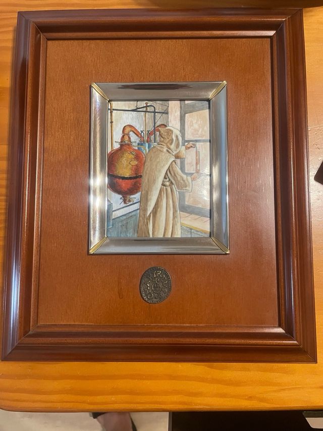 Detalles del productoPrecioso cuadro antiguo que representa una escena de elaboración de Chartreuse en Tarragona. Se encuentra en un marco de madera de color marrón oscuro con un marco interior plateado. Incluye una moneda conmemorativa. Esmalte, monje con alambique