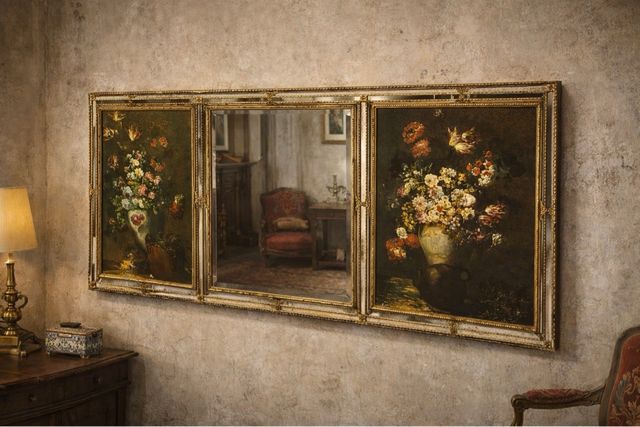 Detalles del productoElegante cuadro antiguo de estilo tríptico, con dos paneles laterales que muestran composiciones florales y un panel central de espejo.