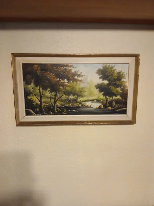 Detalles del productoPrecioso cuadro antiguo, de los años 60, pintado al óleo sobre lienzo. Representa un paisaje natural con un río y árboles frondosos.