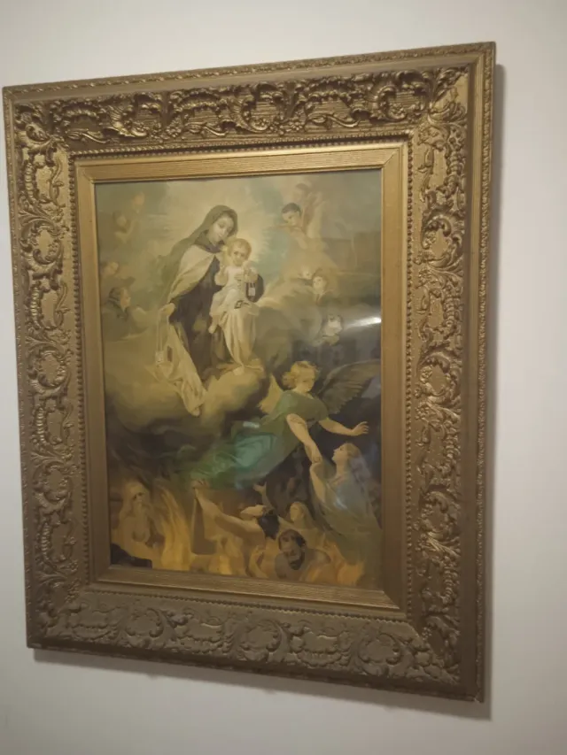 Detalles del productoPintura antigua de temática religiosa, datada en el siglo XIX. Representa una escena celestial con la Virgen María y el Niño Jesús, rodeados de ángeles y figuras en la parte inferior.