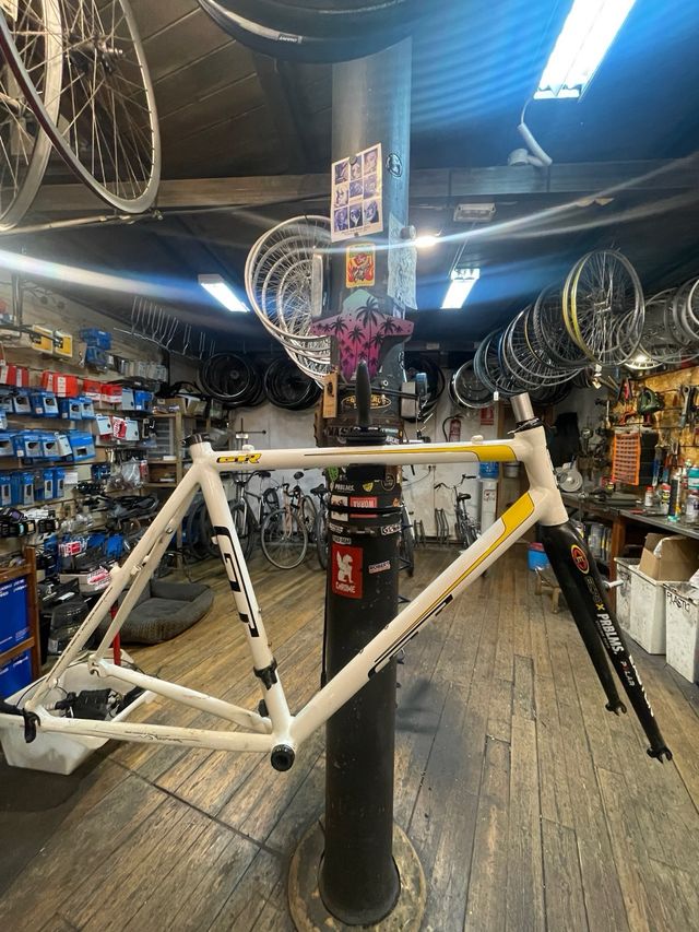 Detalles del productoCuadro de bicicleta GT para ciclocross (CX). Color blanco con detalles amarillos.