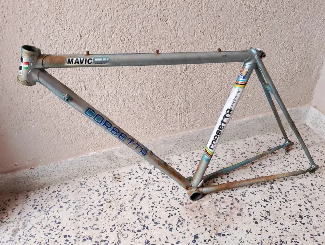 Detalles del productoCuadro de bicicleta Corbetta. Talla 46 para rueda de 700 en bastante buen estado sin golpes ni bollos ,oxido superficial y pintura desgastada paso metrico , incluye el tornillo campagnolo