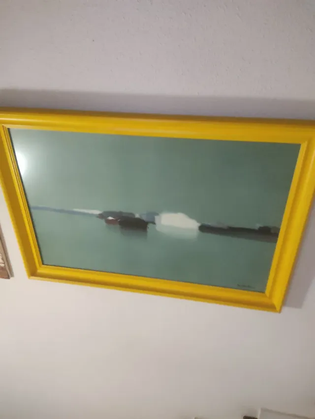 Cuadro original de Pierre Doutrelau. Una pieza de arte única. - Marco amarillo vibrante. - Representación abstracta de un paisaje marino.