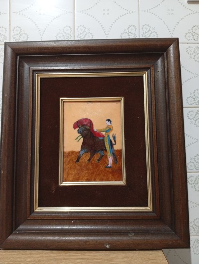 Cuadro vintage con escena de tauromaquia. - Representación de un torero y un toro. - Marco de madera oscura.