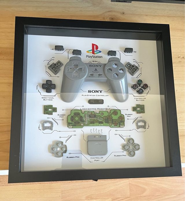 Detalles del productoCuadro despiece de un mando de PlayStation 1, mostrando sus componentes internos.