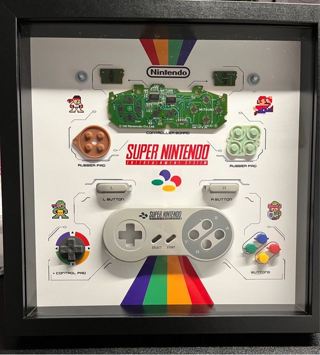 Detalles del productoCuadro del desmontaje de un mando original de Super Nintendo.