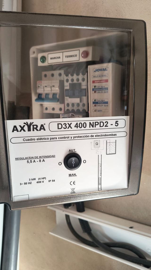 Detalles del productoCuadro eléctrico trifásico Axyra D3X 400 NPD2-5 para control y protección de electrobombas de hasta 4 CV. Se instaló pero no se usó porque el problema no era el cuadro anterior sino la bomba