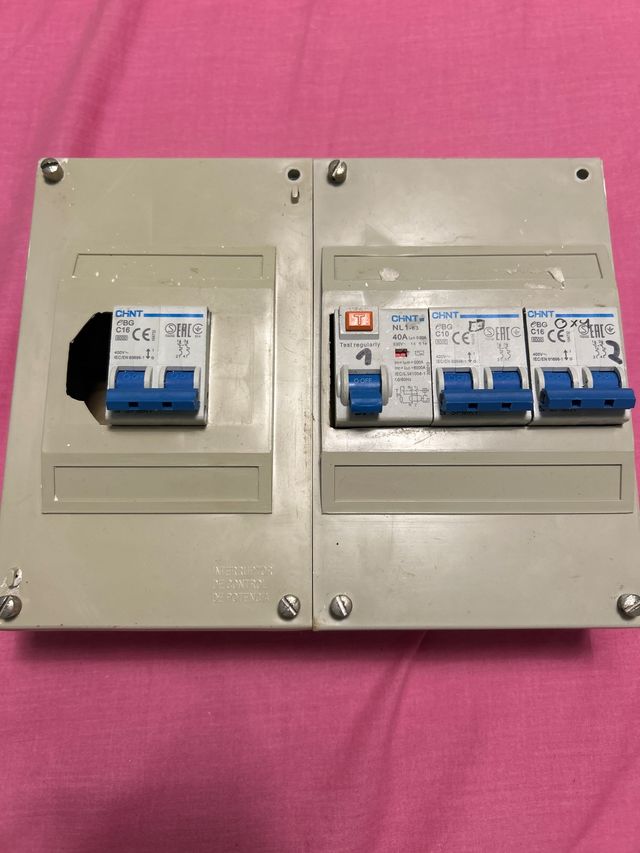 Cuadro eléctrico con varios interruptores automáticos. - Interruptor CHNT C16. - Interruptor CHNT NL1 40A. - Interruptor CHNT C10. - Interruptor CHNT C16.