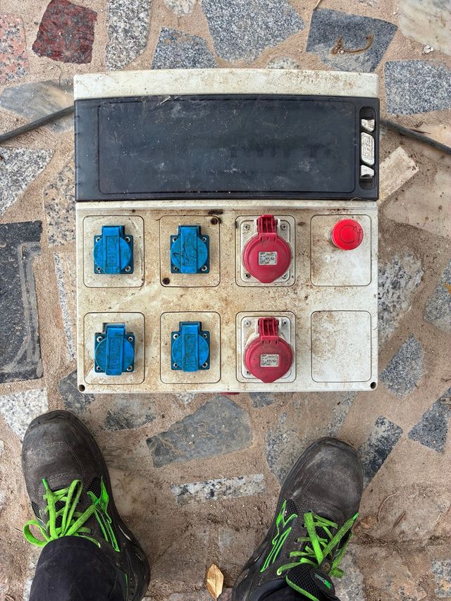 Detalles del productoCuadro eléctrico de obra con varias tomas de corriente y un pulsador de emergencia.