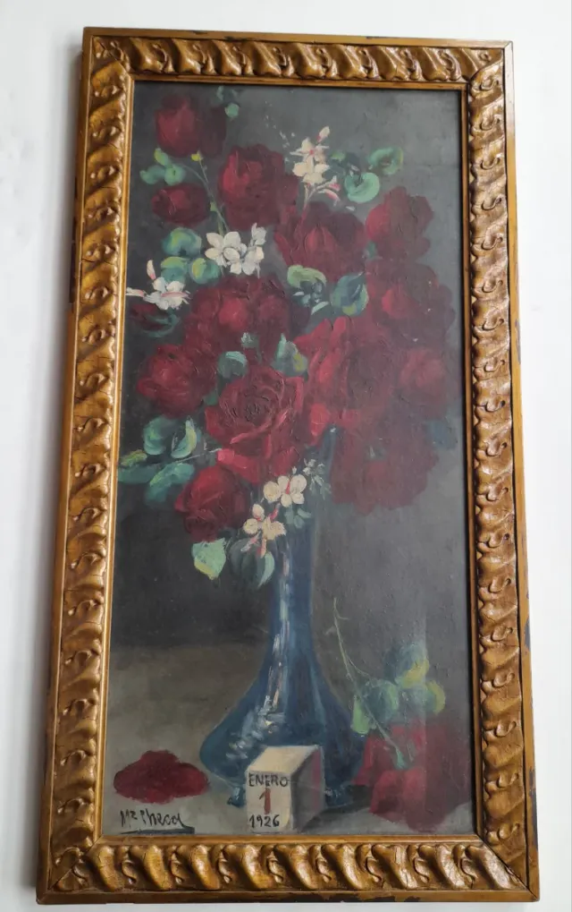 Detalles del productoPintura al óleo sobre carton de un ramo de rosas rojas y flores blancas en un jarrón azul. La obra está firmada por Fernando Martínez Checa y fechada en enero de 1926, en nada 100 años