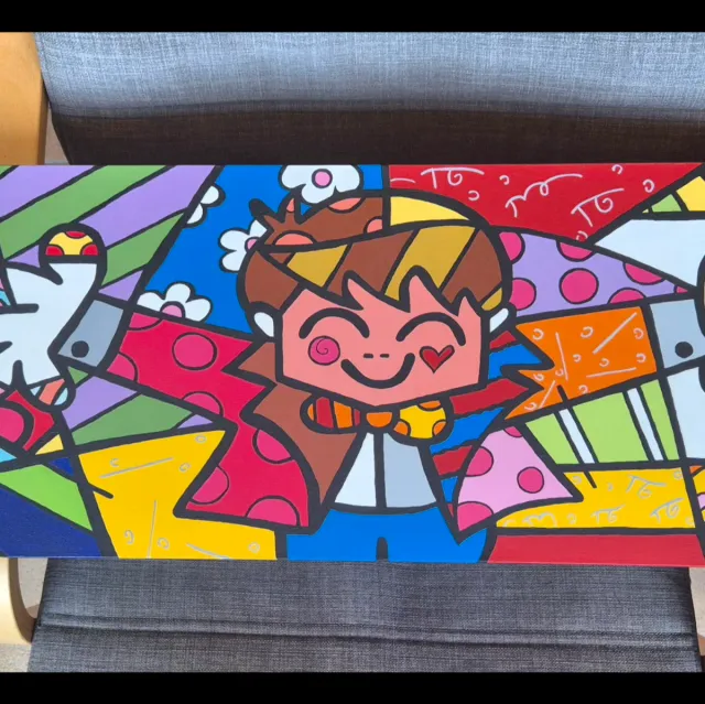 Detalles del productoCuadro decorativo con un vibrante diseño inspirado en el estilo de Romero Britto. Presenta una composición llena de color y formas geométricas.