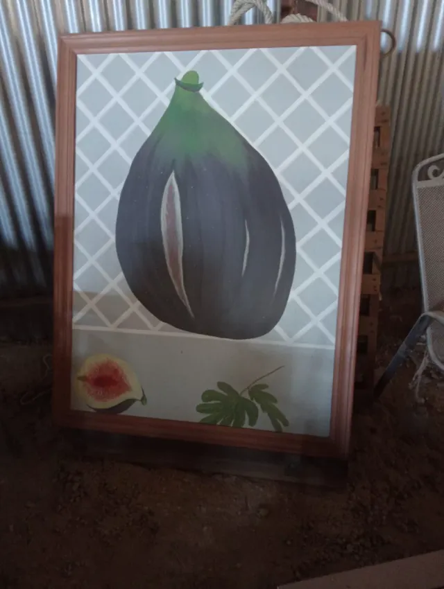 Cuadro decorativo con un diseño de higo. - Representación artística de un higo. - Incluye detalles de una hoja y un higo cortado.