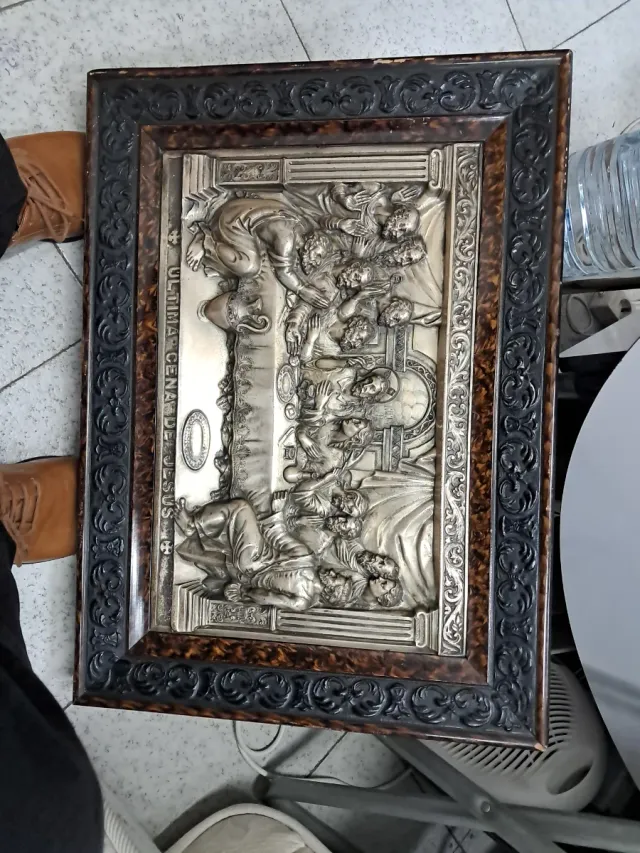 Detalle de La Última Cena de Jesús en relieve. - Marco con diseño de carey y detalles ornamentales. - Relieve metálico plateado con figuras detalladas.