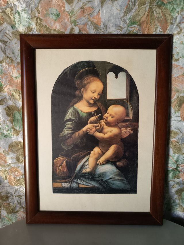 Cuadro decorativo con lámina reproducción de Da Vinci, Virgen y el Niño con Flor. Marco de madera de calidad. Buen estado general con signos del paso del tiempo. Las fotos son parte importante de la descripción.