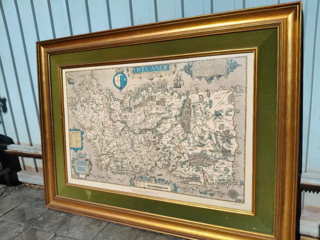 Detalles del productoMarco de madera dorado con paspartú verde para un mapa de Irlanda.