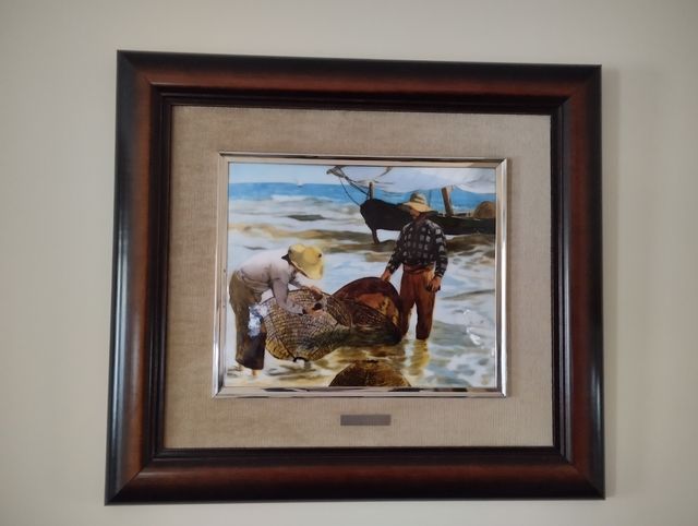 Cuadro pintado esmalte sobre metal. Marco Negroni. Reproducción cuadro de Sorolla. Medidas 61x56 cm el marco marrón de madera y 33x27 la parte pintada.