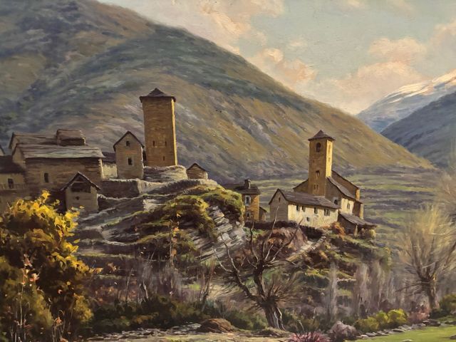 Detalles del productoPreciosa pintura al óleo sobre lienzo que representa un paisaje montañoso con un pueblo. Los colores son cálidos y la escena transmite tranquilidad.