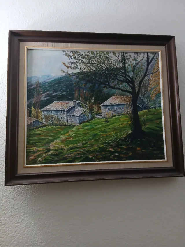 Detalles del productoPintura al óleo de un paisaje rural con edificaciones y vegetación.